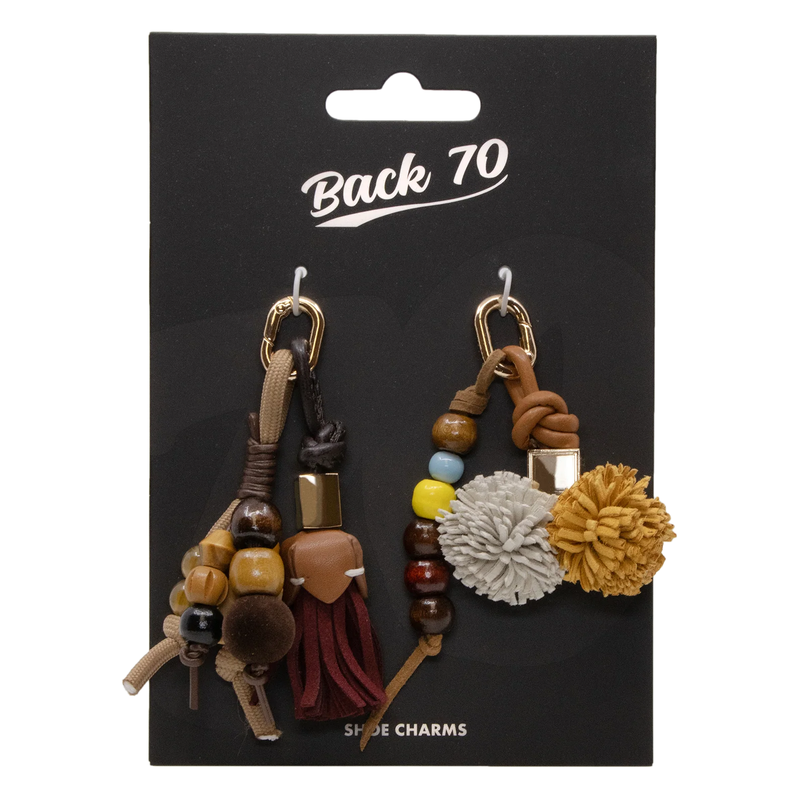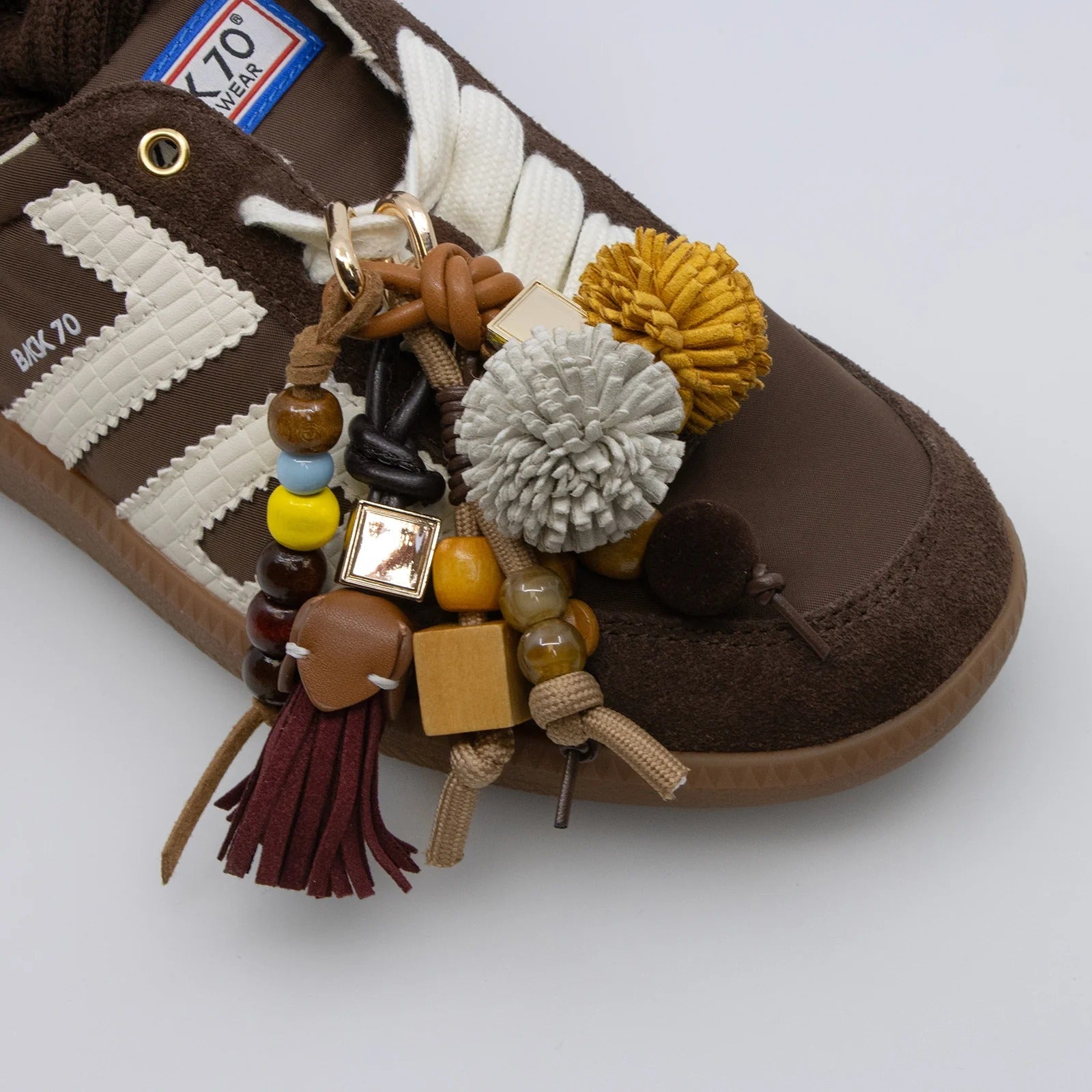 Transform your sneakers into a statement of preppy sophistication with these Elite Charms in Varsity Prep. Each charm brings its own personality—bouncy pom-poms for days when you're feeling spirited, sleek tassels when you want to keep it polished, and handcrafted wood beading that adds an artisanal touch. The color story tells a tale of ivy-covered halls and autumn afternoons: rich cabernet, golden saffron, and classic oxford blue. Every detail matters here, from the careful stitching to the hand-painted edges that catch the light just so. Clip them onto your Back 70 laces and watch your kicks go from casual to curated in seconds. Mix, match, and swap them out as your mood shifts—because why should your shoes stay the same when you don't?