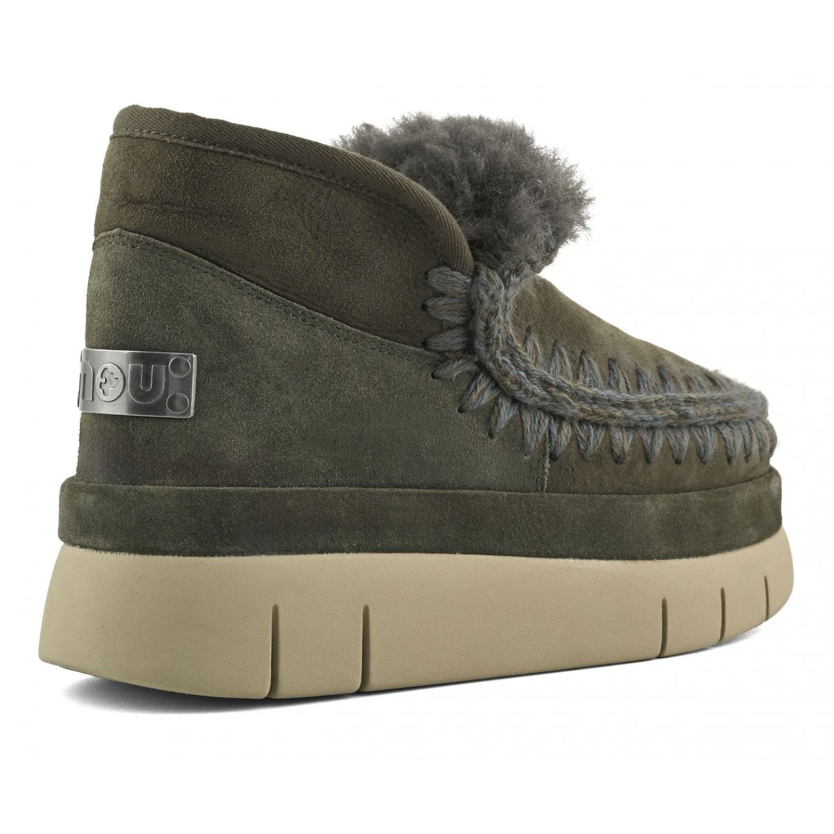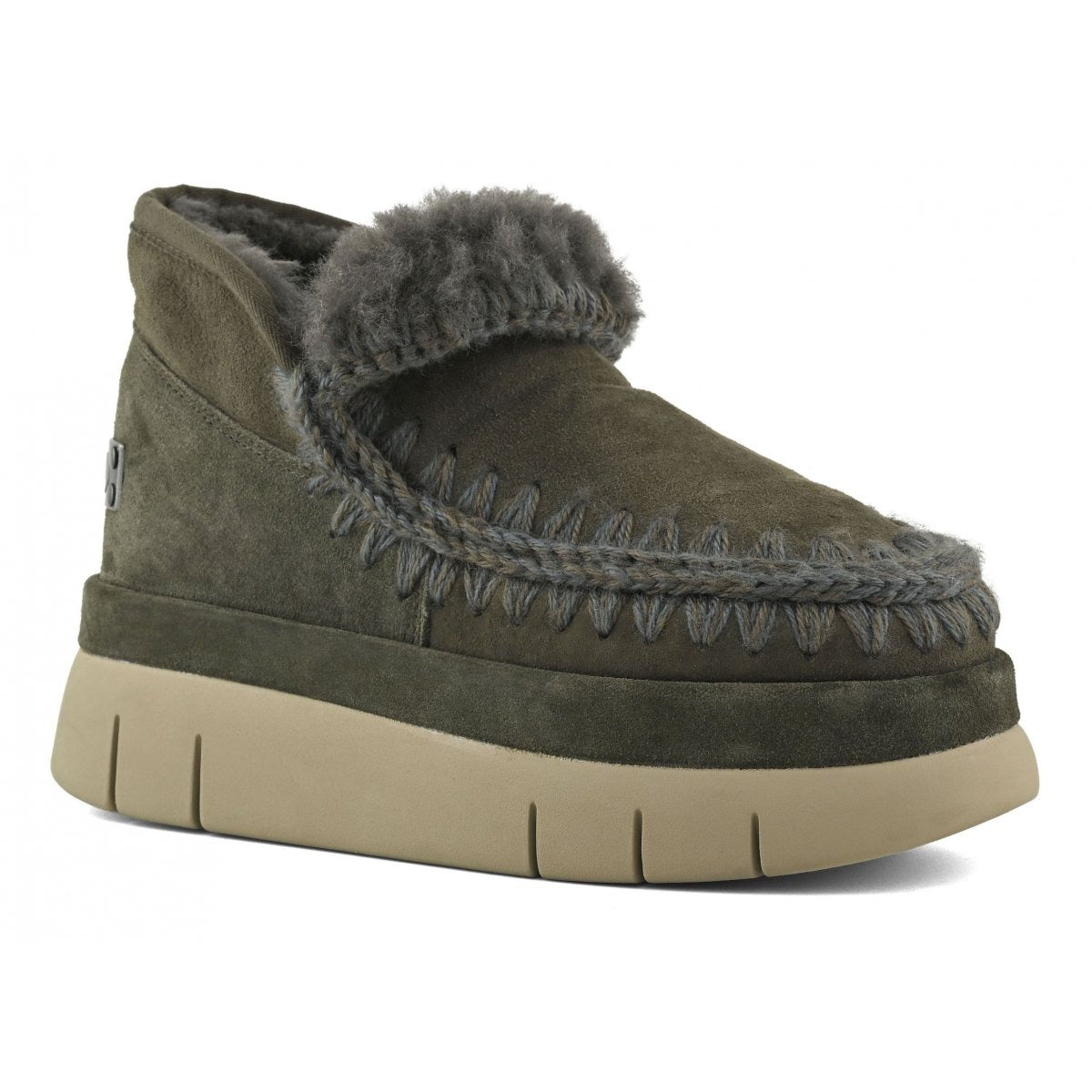 Step up your winter sneaker game with the Mou Bounce Welt Sneaker in Black Olive. Artisanally handcrafted, these kicks boast warm double-face sheep skin and cozy crochet wool stitching for ultimate comfort and style. The soft sheepskin insole cushions every step, while a sleek metal logo adds a dash of flair. Perfect for those who love a playful twist on classic suede sneakers.