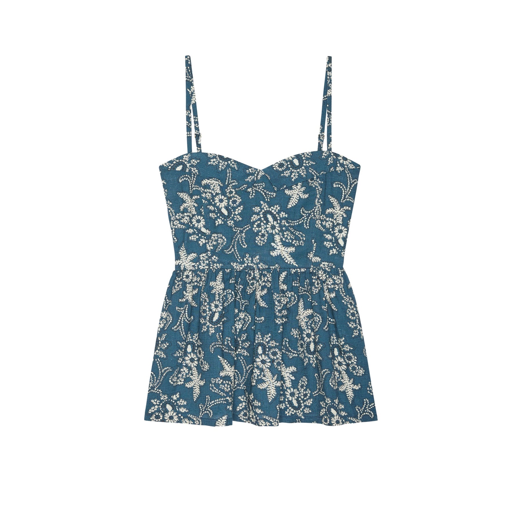 Delicate straps frame the bust with a fitted silhouette that flows into graceful pleats, creating movement and dimension. This indigo bandana-inspired top from Hat Attack brings effortless style with a playful twist—perfect for layering or wearing solo when you want to make a subtle statement.