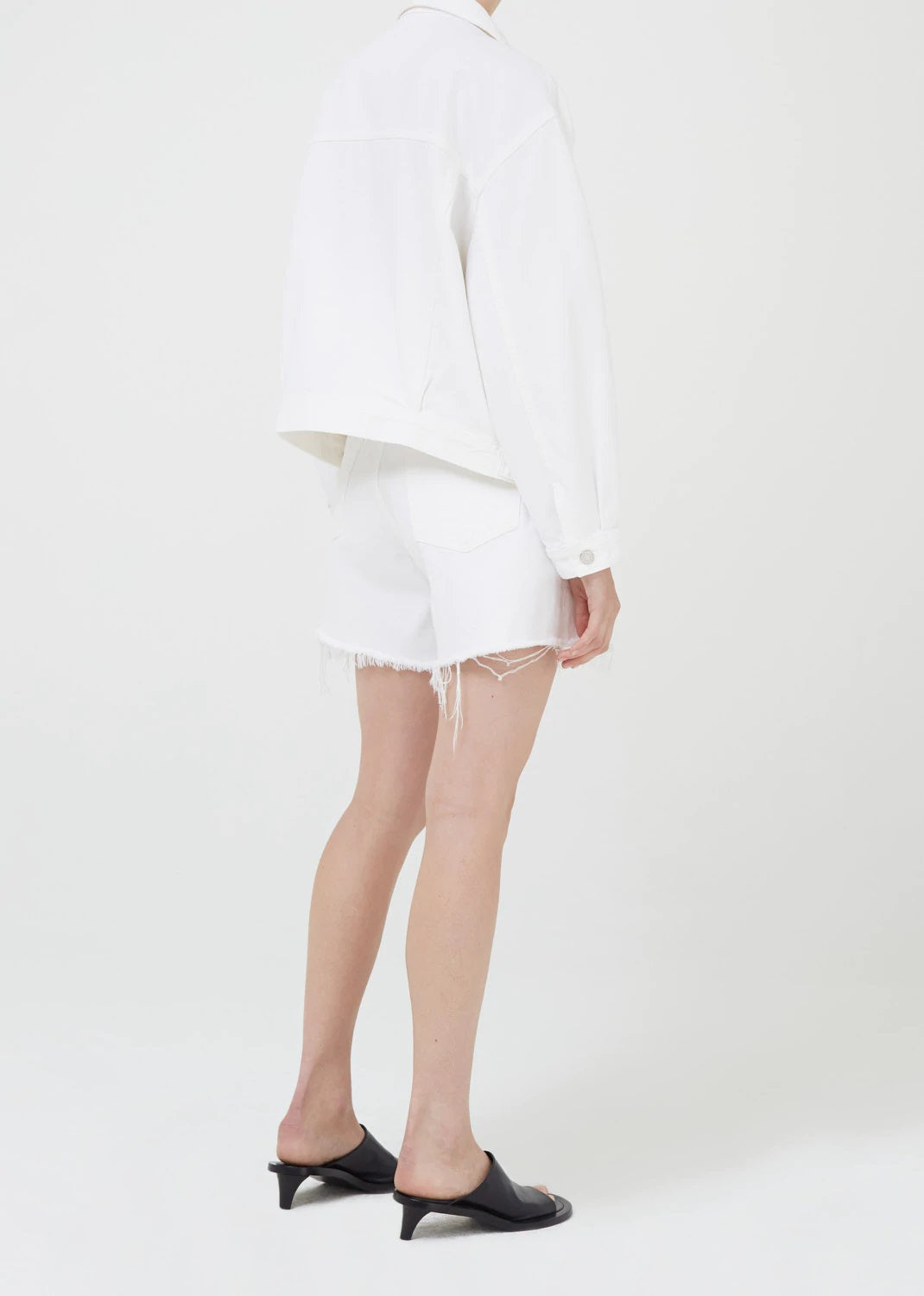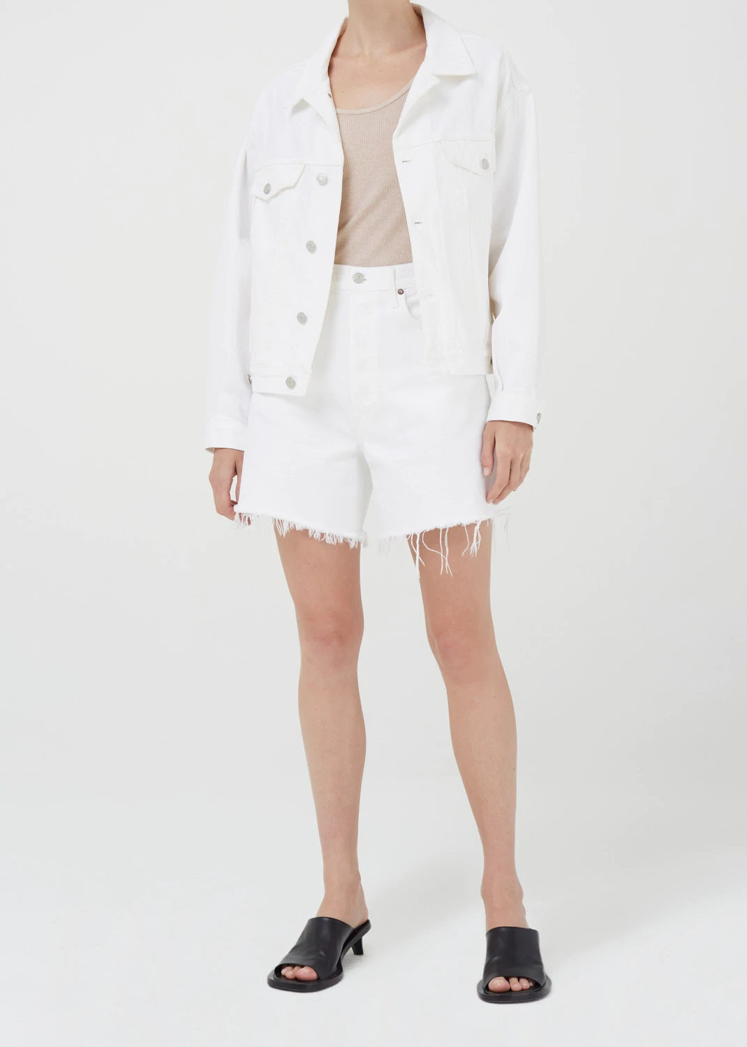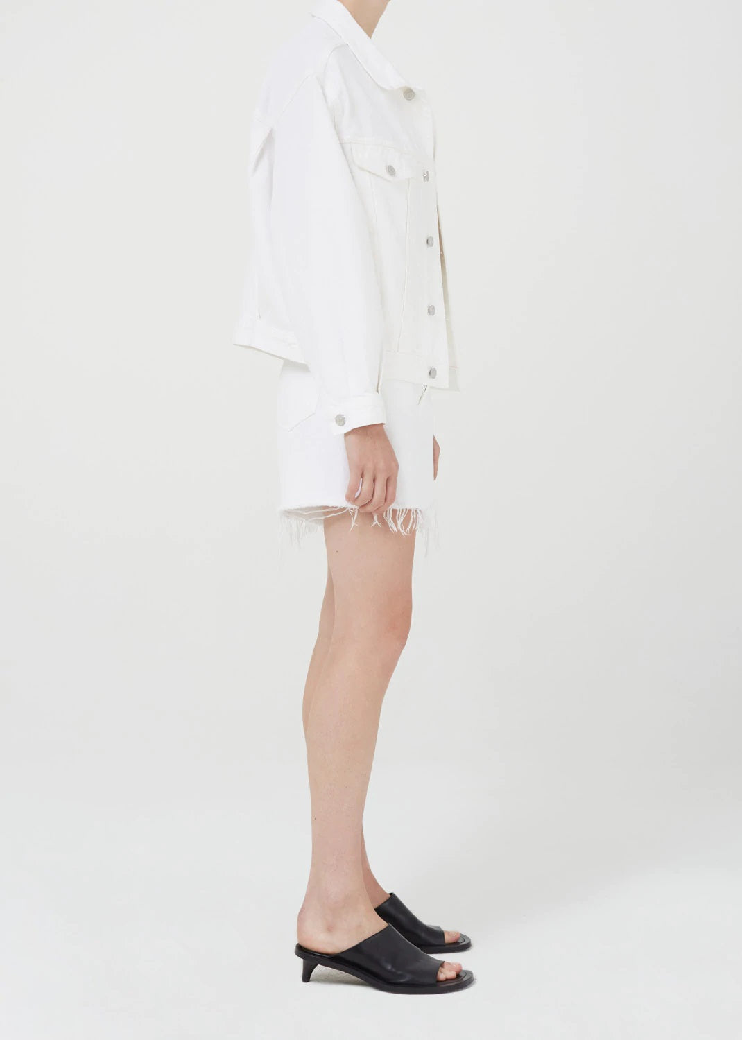 This oversized jacket from AGoldE is the modern update on the denim jacket while still honoring the classic details. Crafted from organic non-stretch denim in off-white, this jacket features a dropped shoulder, slouchy silhouette, chest button-flap pockets, front welt pockets and classic one-button cuffs. Lightweight and versatile, it’ll quickly become your go-to for laidback, casual days
