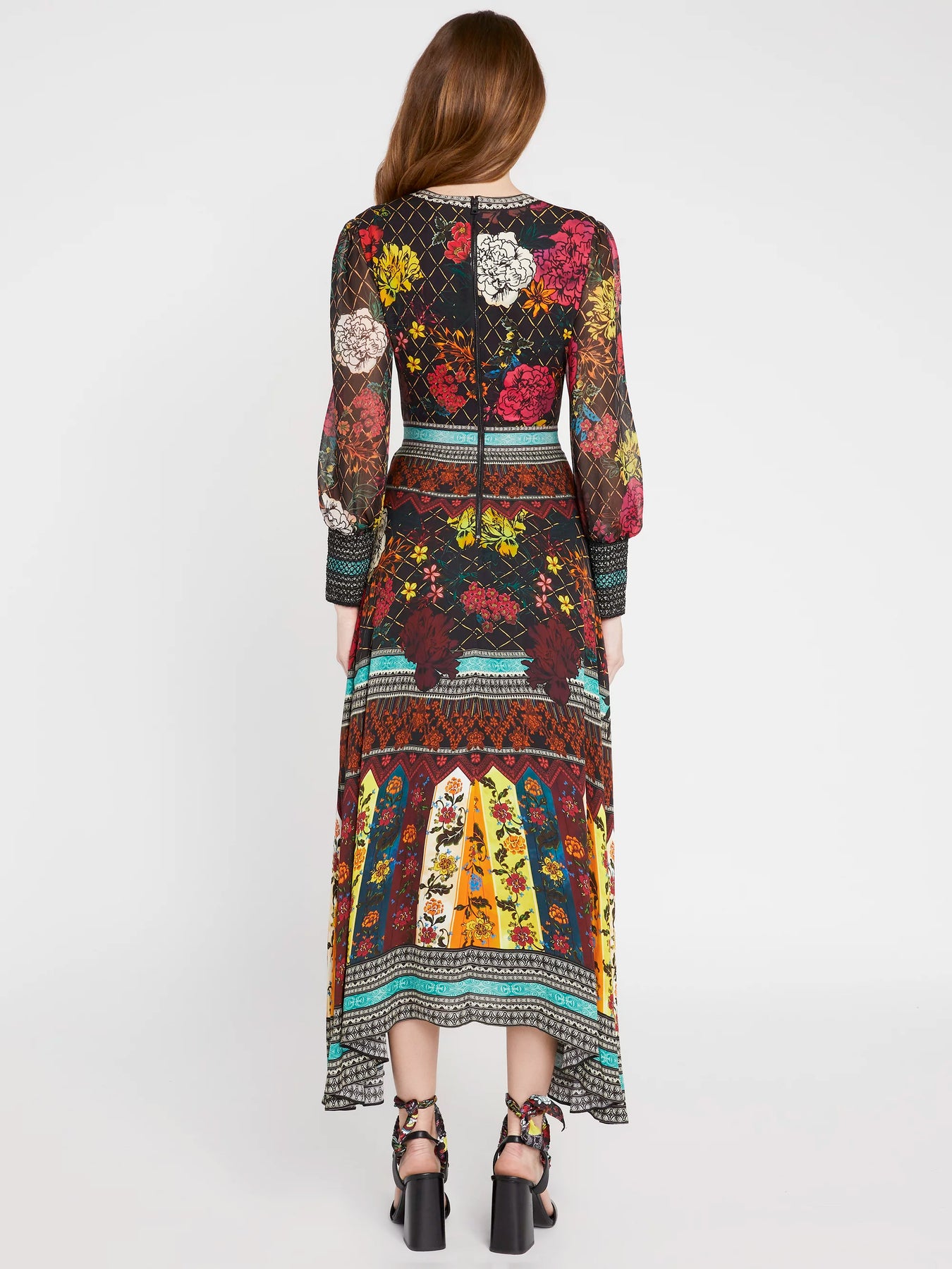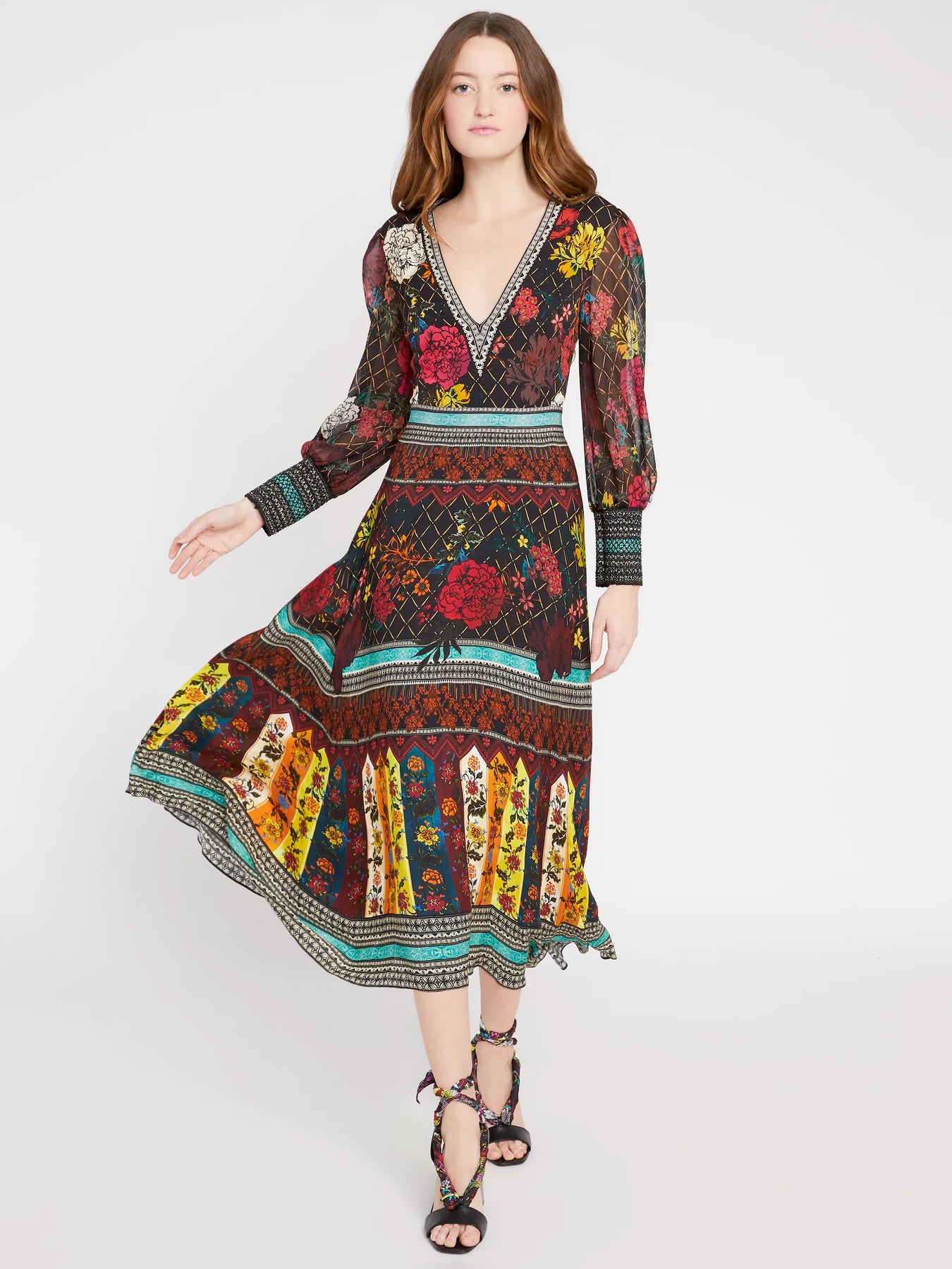 Designed in the prettiest floral print with boho cool vibes, this long-sleeve dress from Alice + Olivia will have you looking forward to sunny days. The bodice has a v-neckline with blouson statement sleeves, and its full maxi skirt brings floaty movement as you sashay through your day. Pair yours with strappy shoes for an elevated look, or tone it down with white sneakers for casual chic.