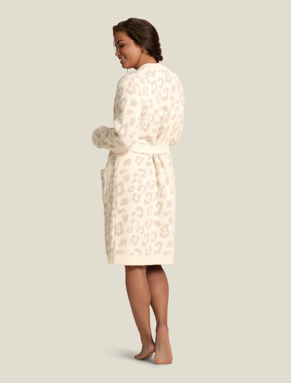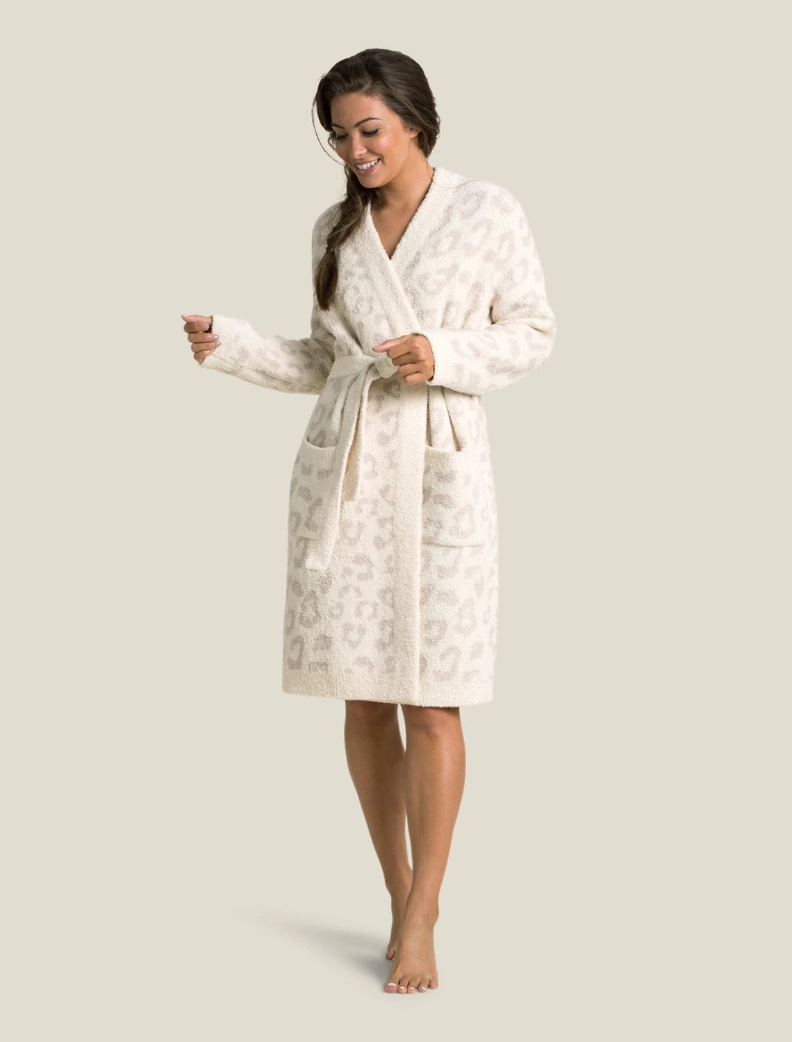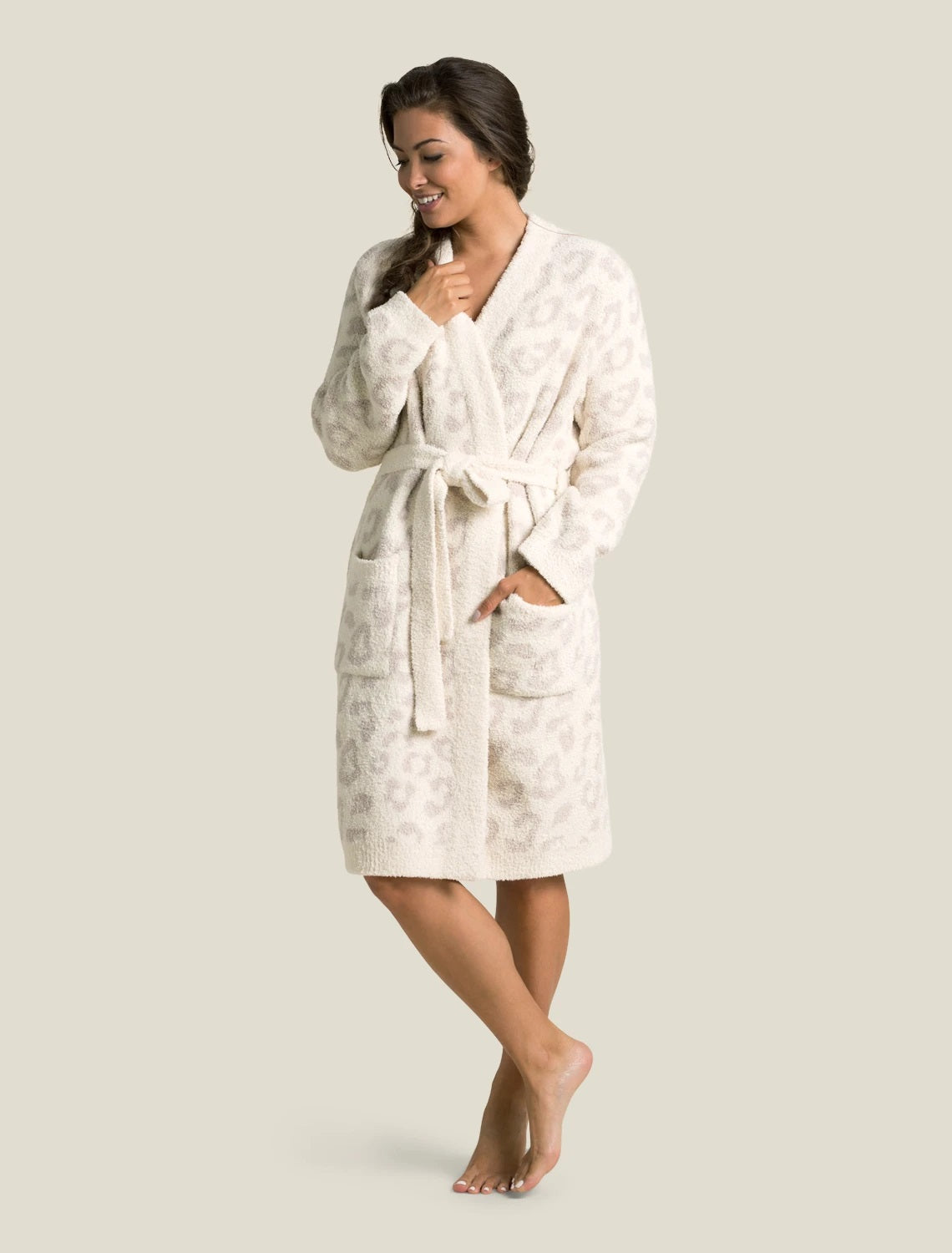 Slip into spa-like comfort with this plush, luxe robe from Barefoot Dreams. Irresistibly soft, this indulgent robe is patterned with subtle leopard prints and has a classic open-front design with a foldover collar, roomy side pockets and adjustable tie waist. Ideal for adding luxury to any home bath, or slipping on after a swim for instant warmth and coziness.