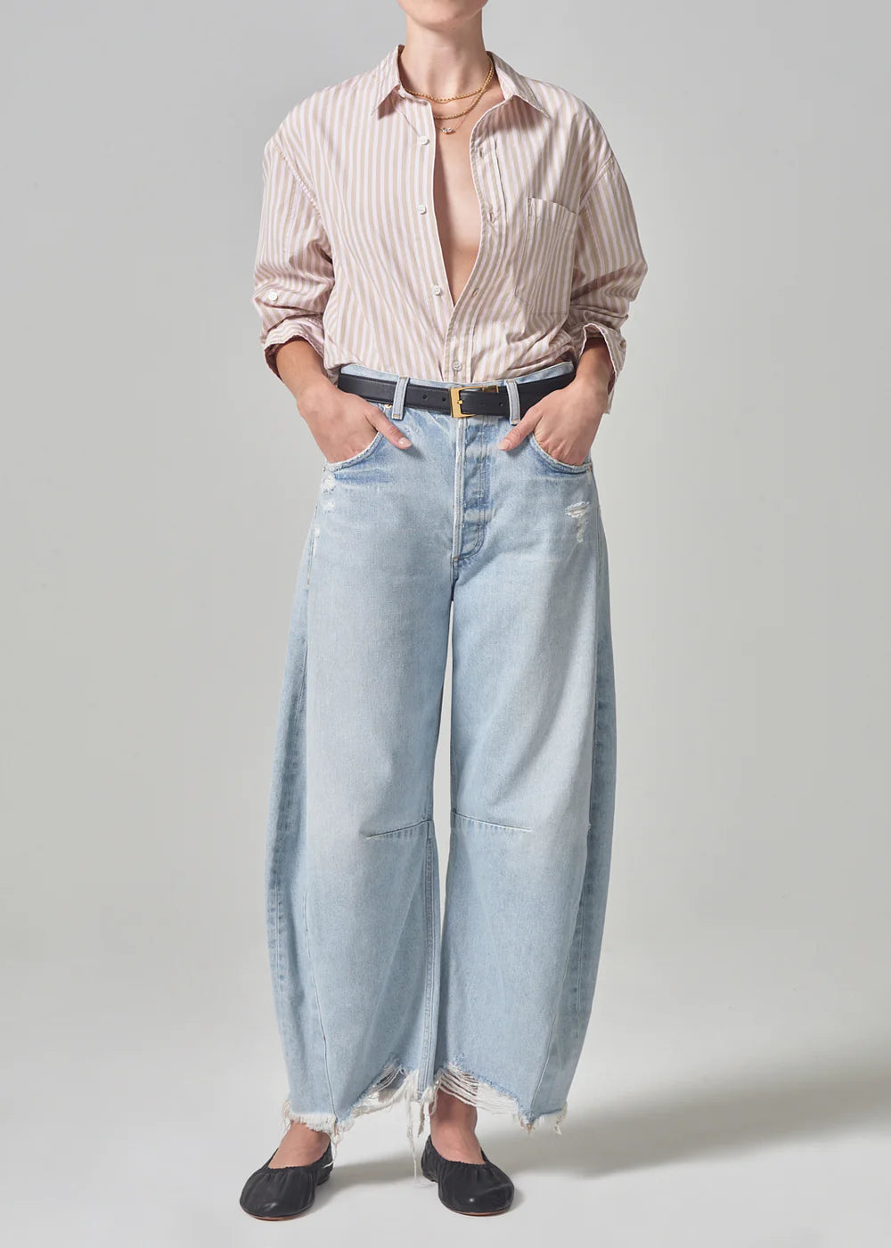 Aptly named, the Horseshoe jean is fashioned with a curved, wide leg that falls to slightly tapered and cropped, frayed hems. This oversized silhouette looks great with a sleek tank.