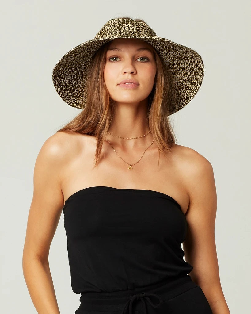 Constructed from natural fibers, the Floria hat is a must-have for any vacation. It rolls up perfectly, perfect for stashing away in your carry-on, while it’s trendy open-top design keeps you cool and breezy wherever the day's adventures lead. Its combination of light and dark weaving makes it effortlessly versatile—what’s not to love?