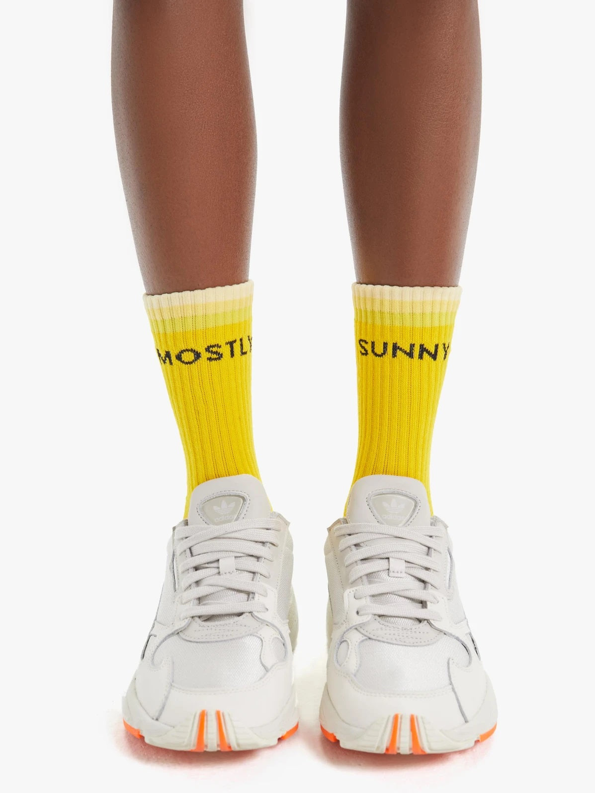 Socks deserve to stand out. In fact, these Baby Steps socks by Mother carry enough clout that they should be the center of your outfit. This pair is crafted in bright yellow with ombré stripes and "Mostly Sunny" printed at the ankle. Slip them on with your favorite white kicks for on-trend styling.