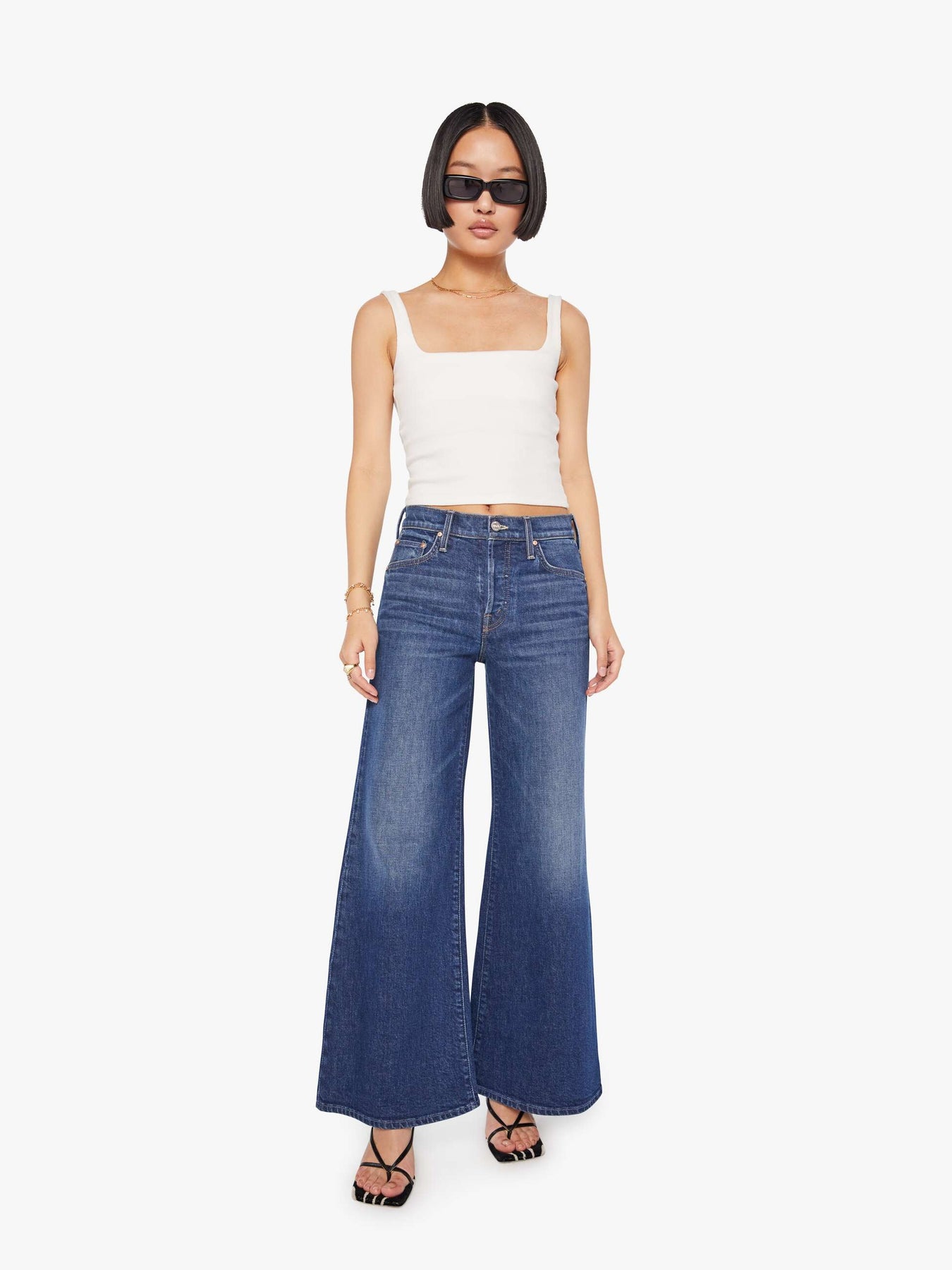 These Mother Denim Lil Tomcat Roller Skimp jeans feature a midrise waist that fits snugly through the hips, then flares out into a wide leg for a fun, flattering silhouette. Perfectly imperfect in every way, they bring a playful edge to your denim collection with their unique fit and effortless style.
