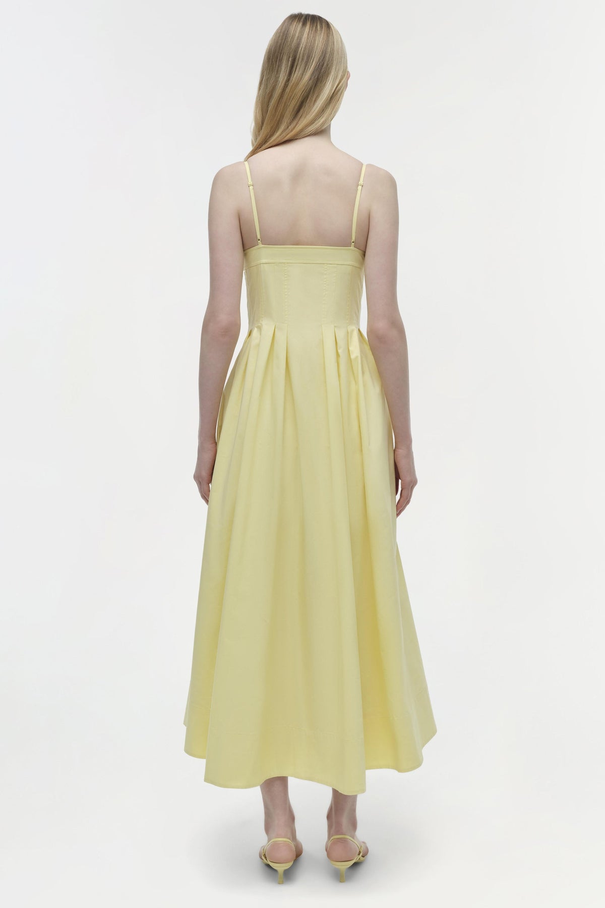 The Simkhai - Kittiya Cotton Midi Dress in Buttercream will have you feeling like a breath of fresh spring air. Made from crisp cotton poplin, this dress boasts a fitted bodice, a graceful A-line skirt, and a demure mid-calf length. Get ready to embrace elegant and playful vibes with this one!