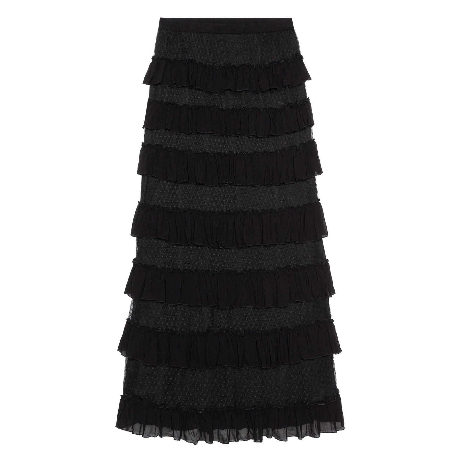 Elevate your winter wardrobe with The Great - Winter Mesh Flounce Skirt in Black. Featuring playful ruffled layers of mesh and delicate lace, this skirt hugs your waist with an elastic band for comfy all-day wear. Its flouncy silhouette adds a fun, flirty vibe perfect for dancing through chilly days and nights.