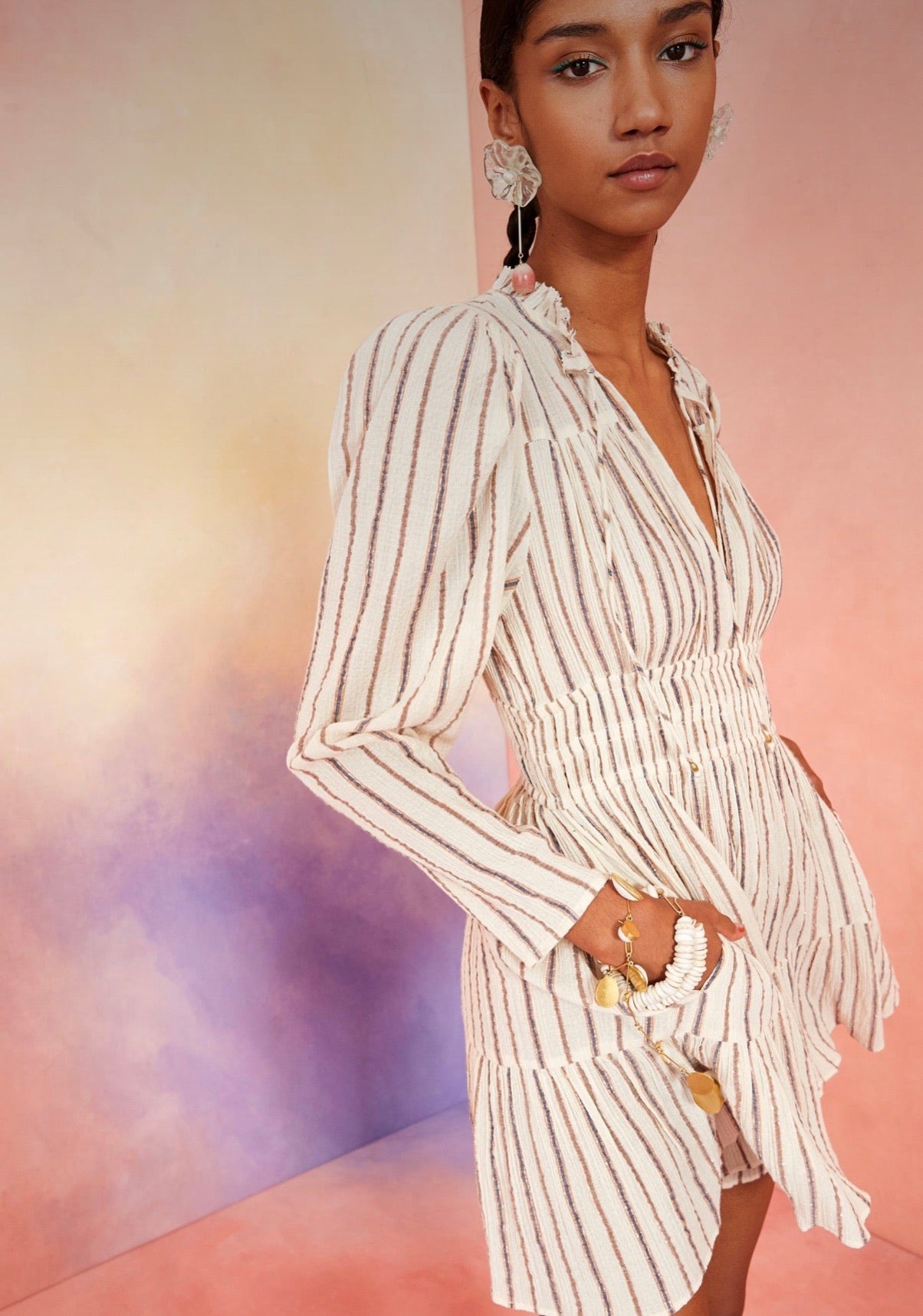 Flirty, floaty, and feminine, the Rosalind Dress from Ulla Johnson features a classic mini dress silhouette with a split neckline and a subtly tiered skirt for extra volume. Ruching at the waist creates a feminine silhouette, and the exaggerated gathering at the shoulders gives the sleeves fun detailing. Pair with oversized earrings and sandals to nail the complete look.