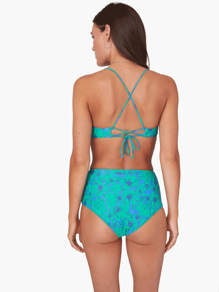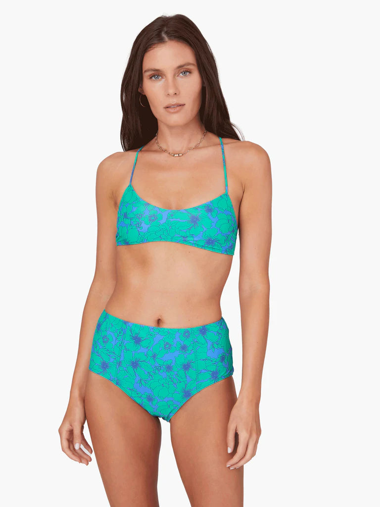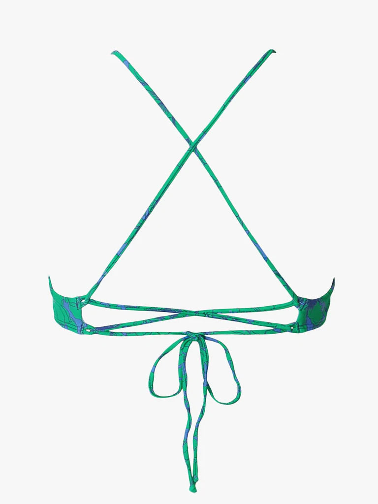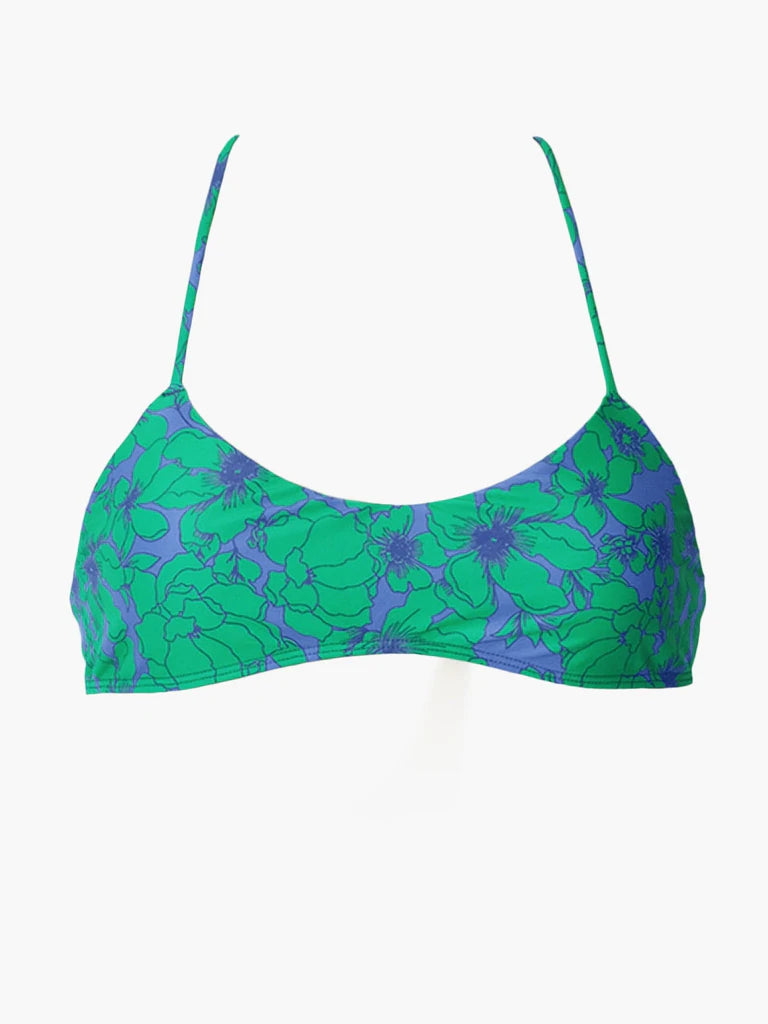 A scoop neck swim bikini top with an adjustable back tie. We recommend the following sizing: S (32A- 34C), M (34B - 36C), L (36B – 38B). Our model is 5'9" and wearing a size Small.