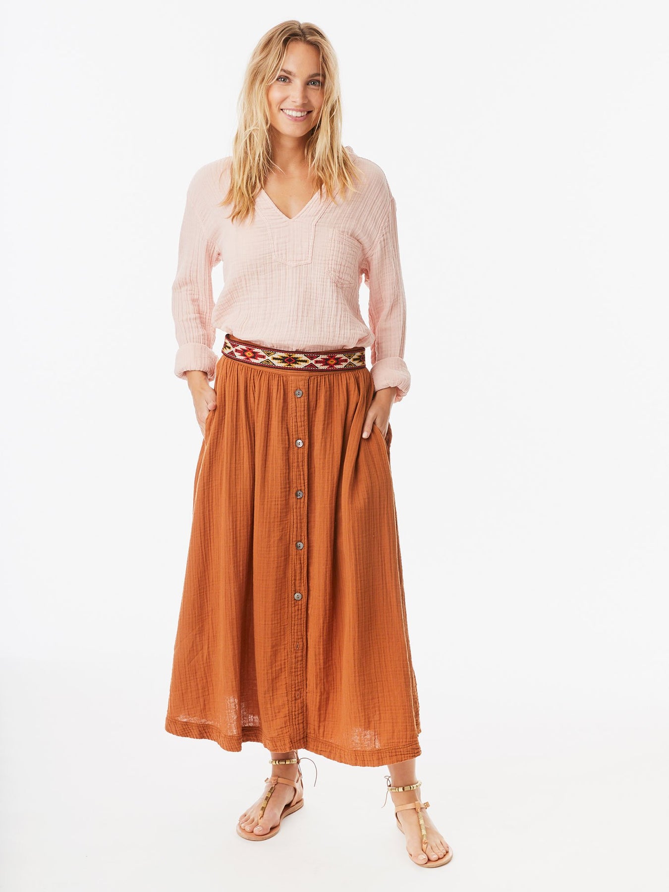 Featuring a high waist and swingy design, the Teagan Skirt from Xirena is cut from their classic Chelsea Gauze for a lightweight appeal. Its full skirt has button front detailing and looks great paired with both fitted tops or drapey ones like the Channing shirt pictured here. Whatever you choose, this skirt will quickly become an everyday go-to.